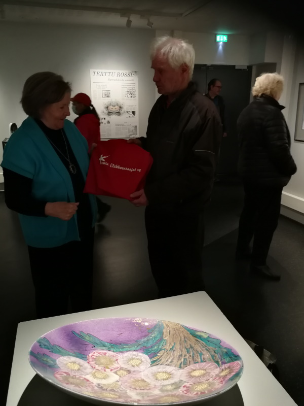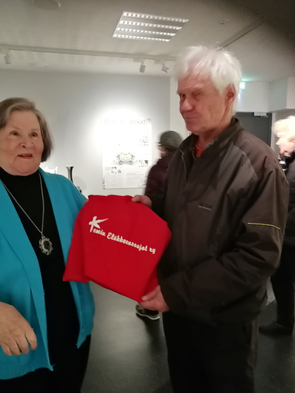 Kiitos Terttu Rossi taidenäyttelyn esittelystä, toteaa puheenjohtaja Pekka Karttunen ojentaessaan punaisen kassin sisältöineen taiteilijalle.