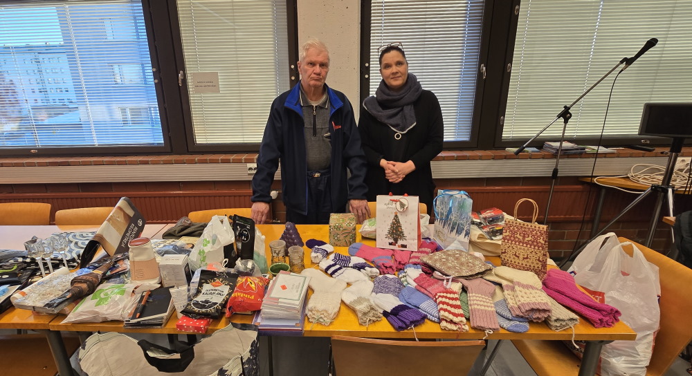 Kerholaisemme lahjoittivat pöydällisen villasukkia , muuta pientä tavaraa ja parikymmentä Peugeottia jaettavaksi apua tarvitseville .