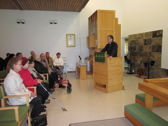 Iso kirkko keltaisenruskeana valkoisin puittein erottuu mutta missä on uusiin kirkko kun kaikkien kolmen piti olla samassa pihapiirissä? Kirkkoherra Heikki Holma kävelee vastaan ja pyytää meidät sisään matalaan rakennukseen. Ja sitten olemmekin uudessa kirkkosalissa, joka saa ensikertalaisen pysähtymään oven suulle ja huokaisemaan ihastuksesta. Päätyseinä on laatoitettu Louen marmorilaatoilla ja siitäpä on syntynyt upea alttaritaulu. Erilaiset laatat muodostavat mitä hienoimpia kuvioita ja mielikuvitus pääsee lentoon. Hiljennymme kuuntelemaan kirkkoherra Holman tarinaa Tervolan kirkoista.